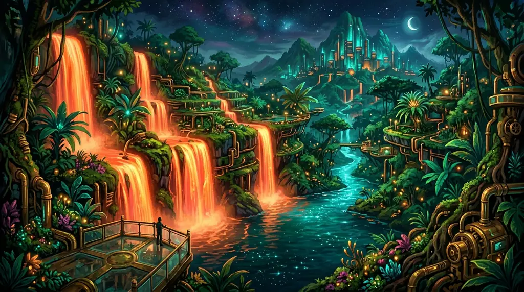 Welcome to the Papaya Splash Arcade, located deep within the Neo-Eden Biosphere. Here, entertainment is powered by nature and technology working in harmony.